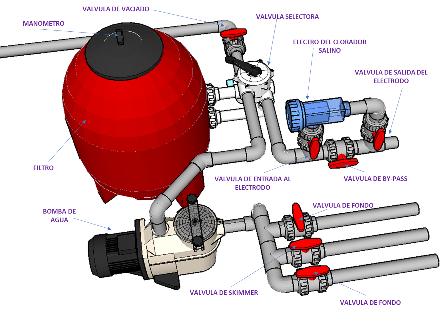 - IMPULSION / BY-PASS: El By-pass es un conjunto de 3 valvulas que debe de tener la instalacion cuando la depuradora esta equipada con un equipo de cloracion salina, su funcion consiste derivar el agua araves del electrodo del clorador salino o evitarlo cerrando el paso al mismo, en las instalaciones que carecen de equipo de cloracion salina unicamente existira una valvula en la conduccion de impulsion que permitira el retorno del agua a la piscina